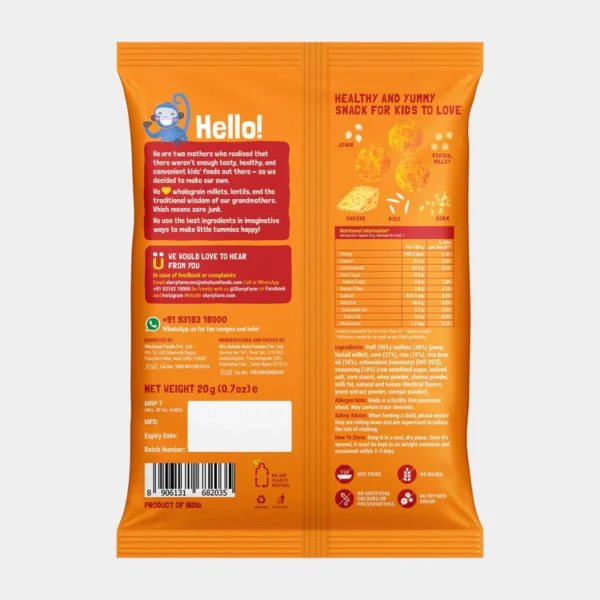 • Made with foxtail millet, corn, rice, cheese, and jowar. 100% honest ingredients and no artificial flavours